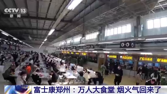 和产能与信心一同回来的,还有园区里的烟火气。富士康郑州园区的万人大食堂里,正值午饭时分, 河南烩面、川味钵钵鸡、广东煲仔饭、珍珠奶茶,天南海北的美食再次相聚在这里。特色食档的老板张振学一个中午就能卖出一千多份餐时。现在,万人大食堂里,28个档口全部开张,最多时,一顿饭有一万两千多人同时就餐。