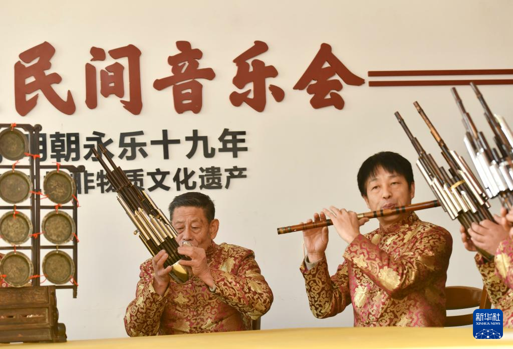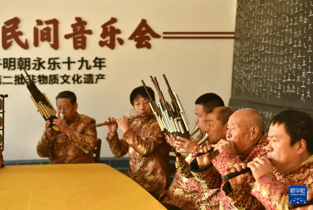 1月10日,在任丘市梁召镇辛安庄村文化活动室里,民间艺人在辛安庄民间音乐会排练中吹奏《淘金令》曲目。新华社发(苑立伟/摄)