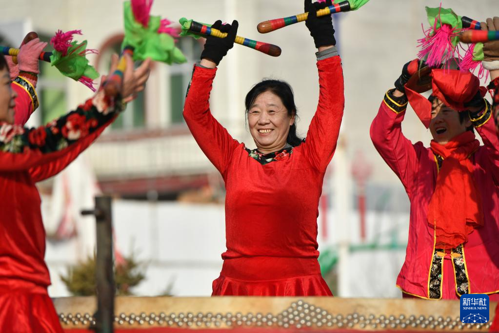 1月10日,在任丘市梁召镇辛安庄村文化广场,鼓手在排练河北省级非遗项目任丘大鼓。新华社发(苑立伟/摄)