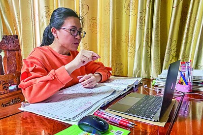 2022年1月5日晚,广西东兴中学一名老师在家为学生上网课。新华社发