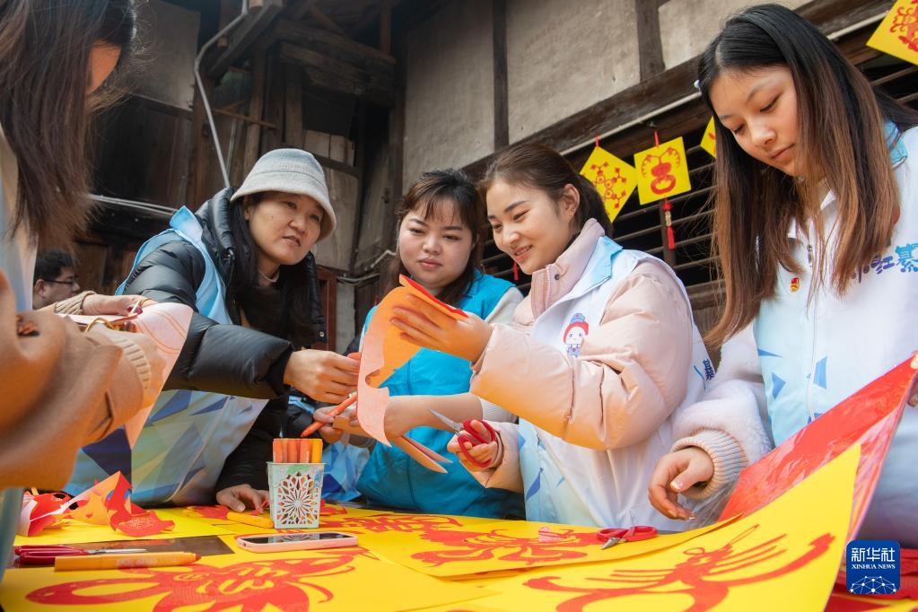 1月11日,志愿者在“山村喜事多”活动上为村民剪窗花。新华社记者唐奕/摄