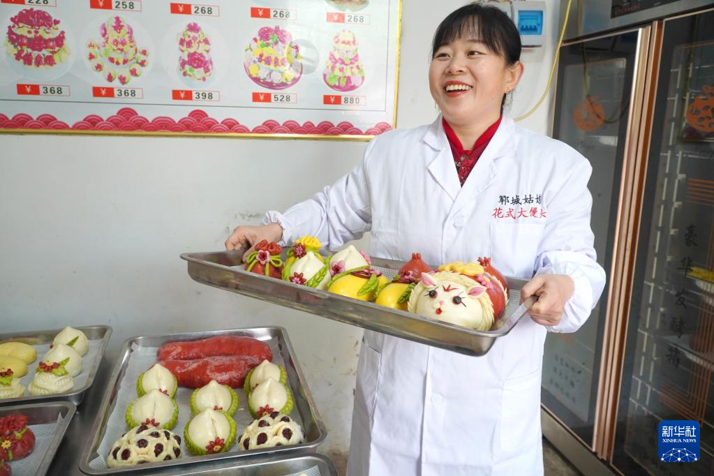 春节临近,山东省郓城县的农民赶制花馍等传统面食,供应节日市场。花馍造型别致、色彩丰富,为即将到来的新春佳节增添了浓浓的喜庆气氛。