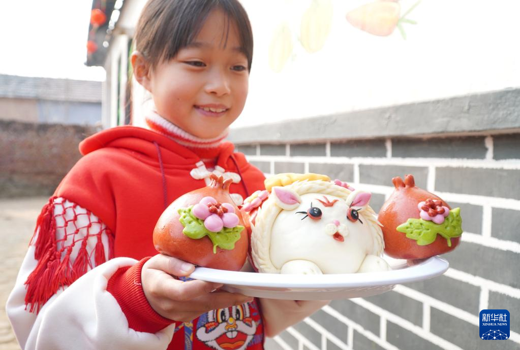 1月11日,在山东省郓城县玉皇庙镇韩庄村,一名小朋友端着兔子造型花馍。新华社记者徐速绘/摄