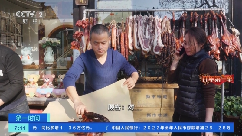 位于浙江德清新市古镇内一家腌货店里,老板娘罗敏接到了开年第一个大订单——来自杭州顾客的800份酱鸭礼盒,这是这家小店开年以来收到的最大惊喜。放下电话,铺子里的伙计们忙了起来,打包、分装,红红火火地开启了忙碌的2023年。