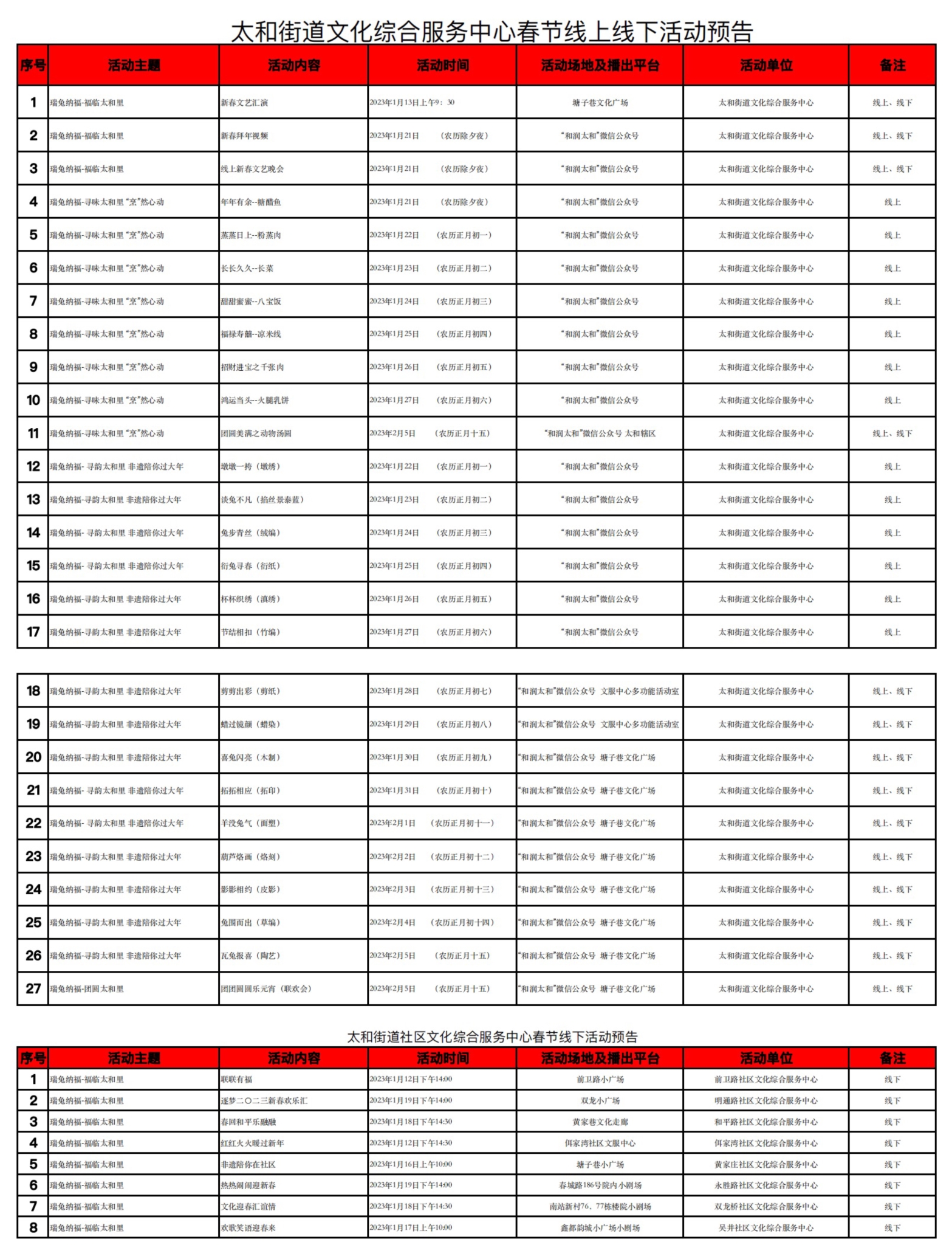 在场群众纷纷表示:本次活动丰富了大家的文娱生活,对于即将到来的2023年也更加期待了。春节期间,太和街道文化综合服务中心还将推出“福临太和里”新春文艺汇演、“寻味太和里”传统美食教学、“寻韵太和里”非遗陪你过大年和“团圆太和里”元宵联欢会四个系列三十五场活动,弘扬优秀传统文化,增强辖区群众的文化认同感与生活幸福指数。