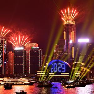 1月1日,香港维多利亚港上演“幻彩咏香江”加强版烟火光影汇演,迎接2023年的到来。新华社记者 陈铎/摄