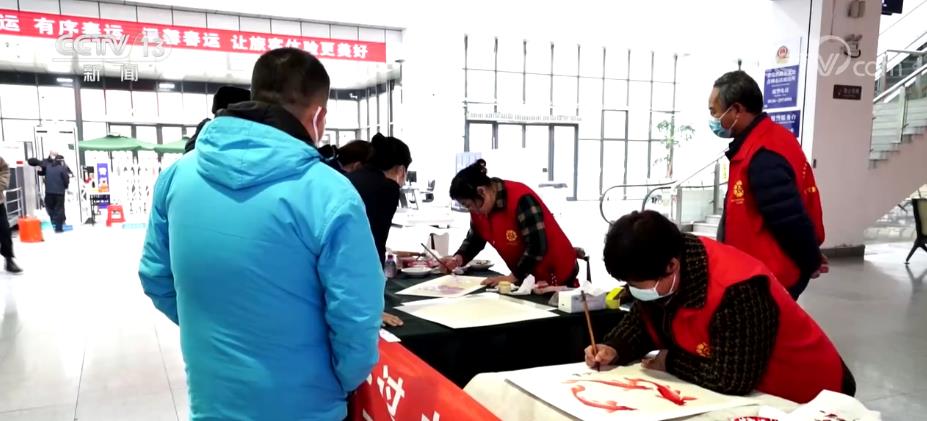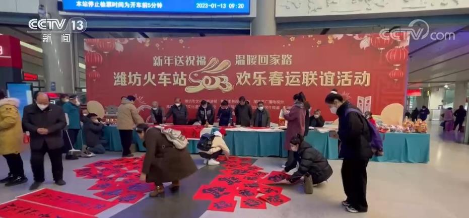 在山东潍坊火车站的候车大厅,潍坊风筝、杨家埠木版年画、高密泥塑等琳琅满目,吸引了不少旅客的目光。非遗传承人和书法家也走进候车大厅,为返乡的旅客送去真挚的新年祝福。在青州火车站,书法家们还现场挥毫泼墨,一张张包含祝福的“福”字,让旅客们感受到浓浓的年味。
