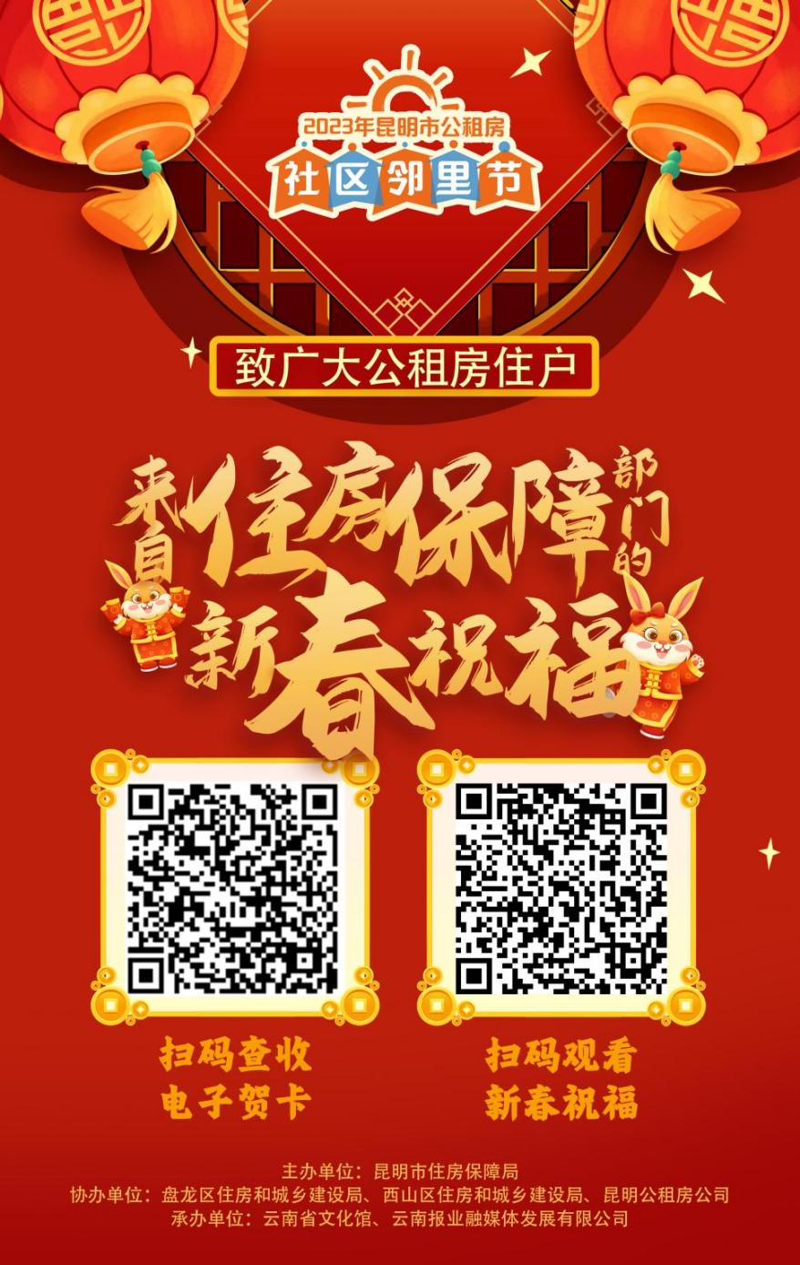 除“新春大礼包”外,昆明市住房保障局应用新媒体技术,首次为全市公租房住户送上H5电子贺卡,点击贺卡抽取专属春联,可以为亲朋友好送上独属于公租房社区邻里节的新春祝福;住房保障部门共同录制了诚意满满的新春祝福视频,为全市公租房住户送上了诚挚的问候和新年祝愿。住户扫描二维码即可观看视频,收取电子贺卡。