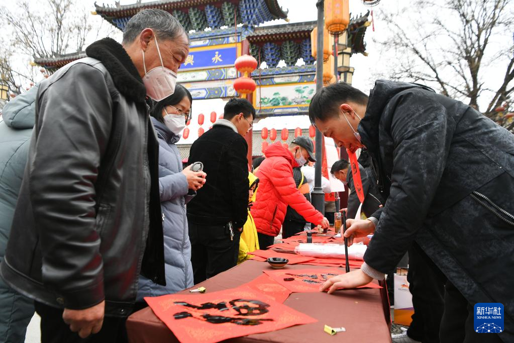 1月14日,书法爱好者在西安市永兴坊景区为游客书写春联、福字。新华社记者张博文/摄