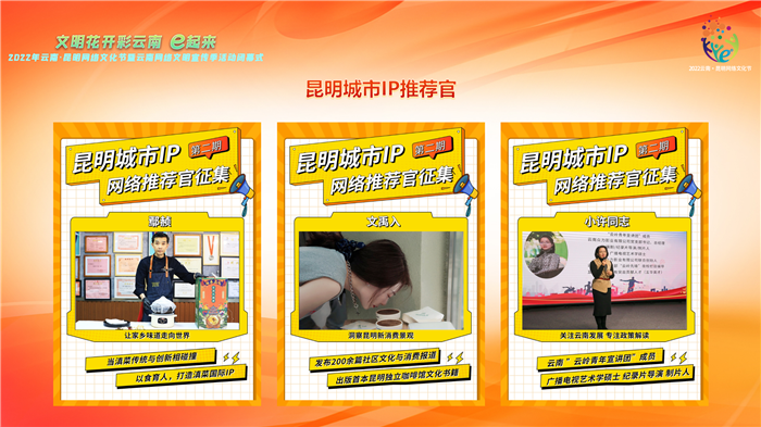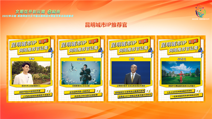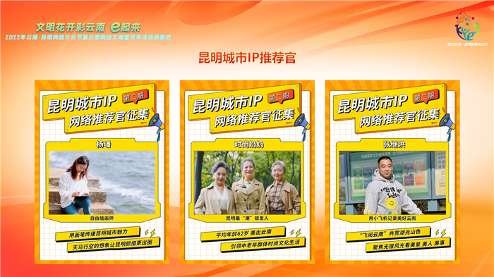 2022年新推的“昆明城市IP网络推荐官”活动,面向全社会征集热爱昆明、了解昆明的社会名人、大V、网络达人,推介自己的家乡,展示昆明的“美貌”和“才华”,在网络空间凝聚起奋进新征程、建功新时代的磅礴力量。征集活动开展以来,共评选出20名IP网络推荐官。他们来自社会各行各业,有金融行业、美食餐饮等行业工作者,有探店博主、插画师等自由从业者,也有专业从事研究昆明历史文化、消费市场的学者。这里面有70岁推动昆明红色文化传承发展的关保昌,有多位60岁老奶奶组成的时尚群体,还有一批00后年轻电竞选手……他们用自己的方式,影响着身边的人,让昆明的美好能够被更多人看见。