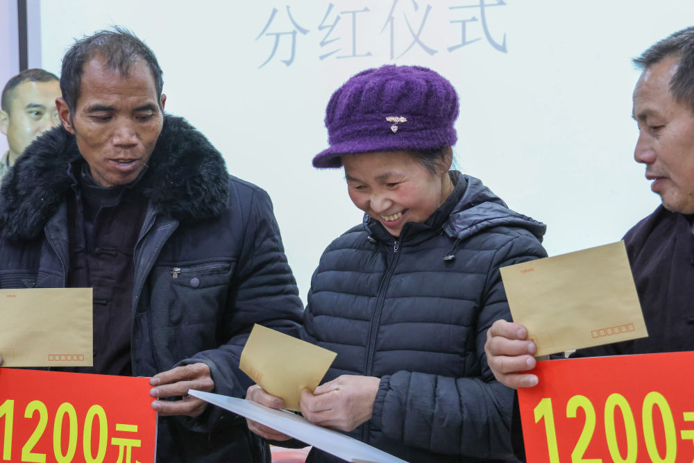 2023年1月11日,贵州省麻江县龙山镇河坝村举办蜂蜜加工产业扶贫项目分红仪式,村民领取到1200元产业分红金。新华社记者赵昭 摄