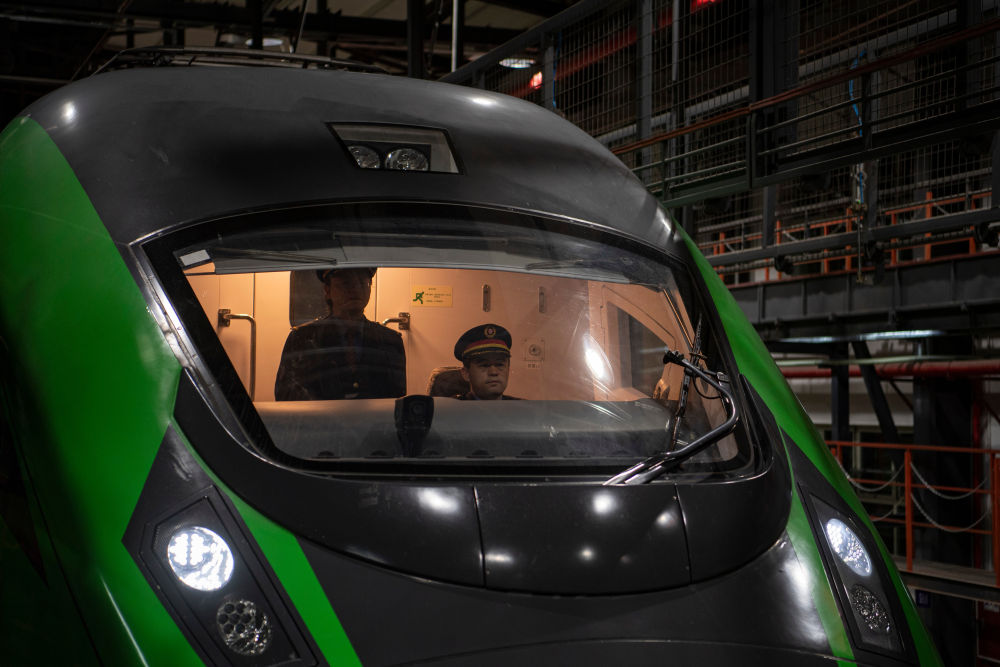 在拉萨机辆整备中心,黄起岗(右)和同事将动车组驶入停车位置(1月11日摄)。