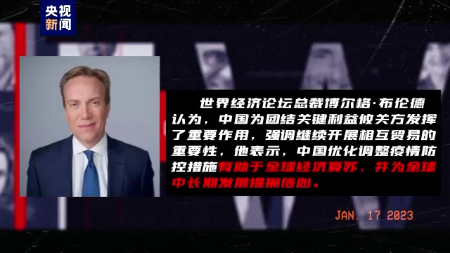 世界经济论坛总裁博尔格·布伦德认为,中国为团结关键利益攸关方发挥了重要作用,强调继续开展相互贸易的重要性。他表示,中国优化调整疫情防控措施有助于全球经济复苏,并为全球中长期发展提振信心。