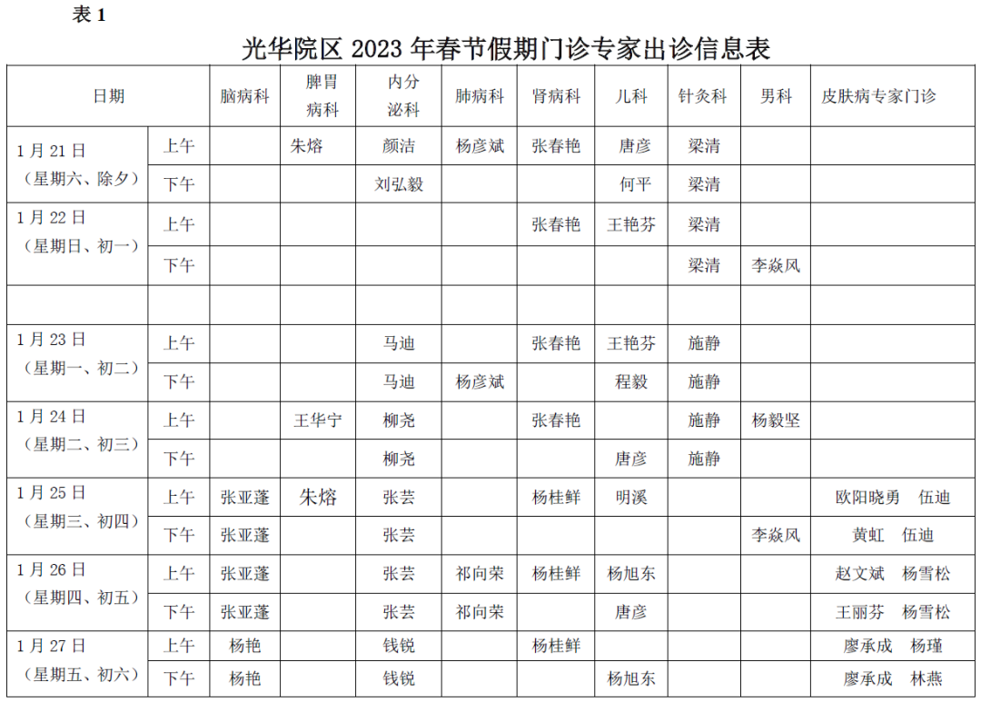 附件:光华院区(表1)、滇池院区(表2)春节假期门诊专家出诊信息表