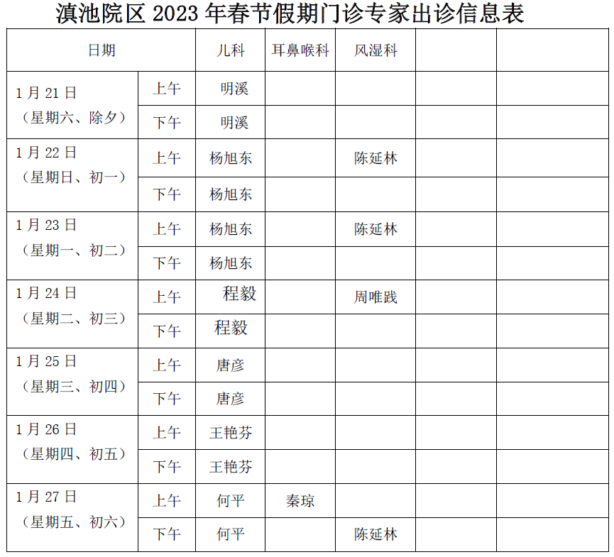 昆明信息港讯 记者曹芸 记者从云南省中医医院获悉,2023年春节放假时间为1月21日(周六、除夕)至1月27日(周五、初六),共7天,1月28日(周六)起恢复正常门诊工作。