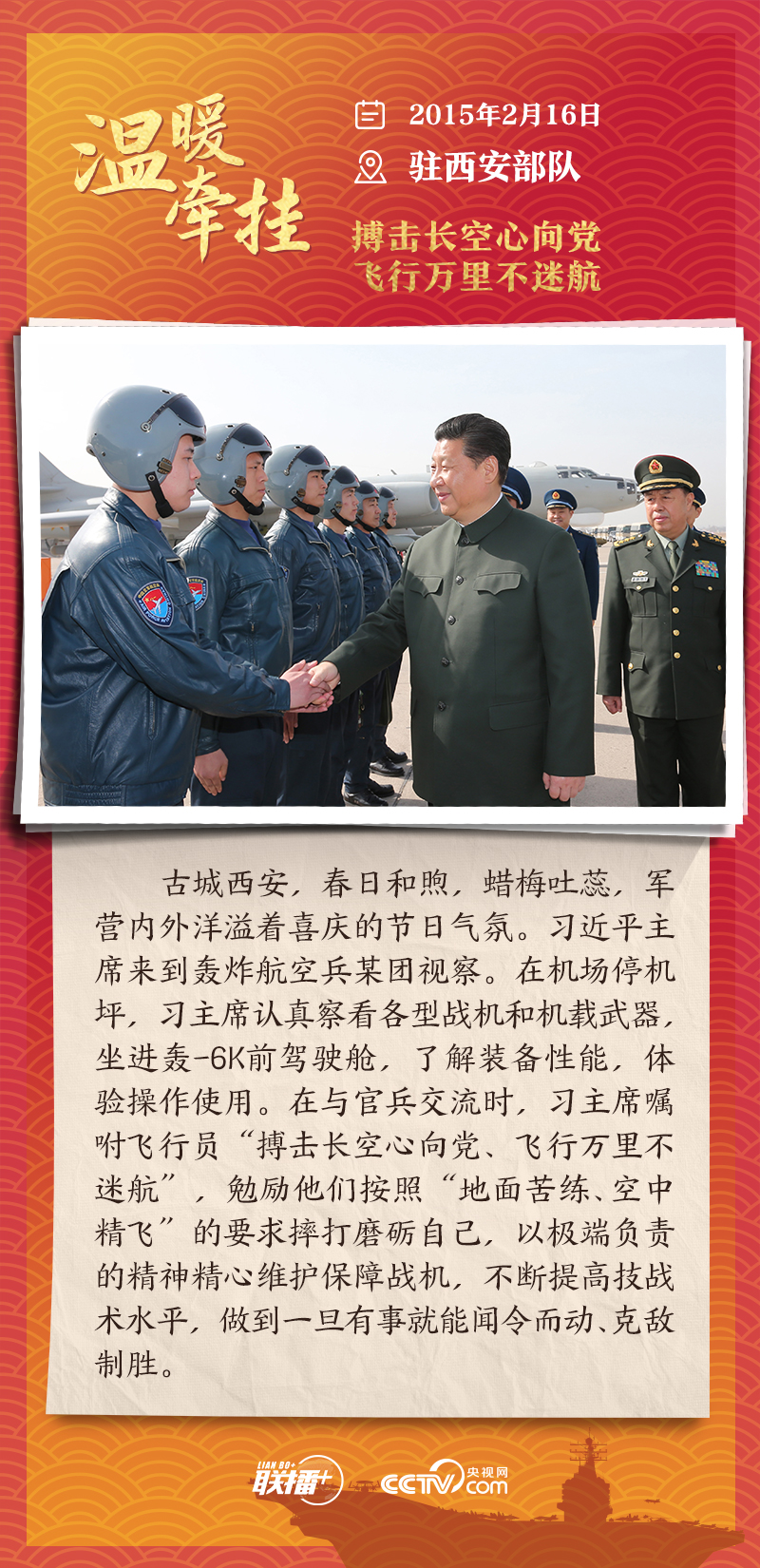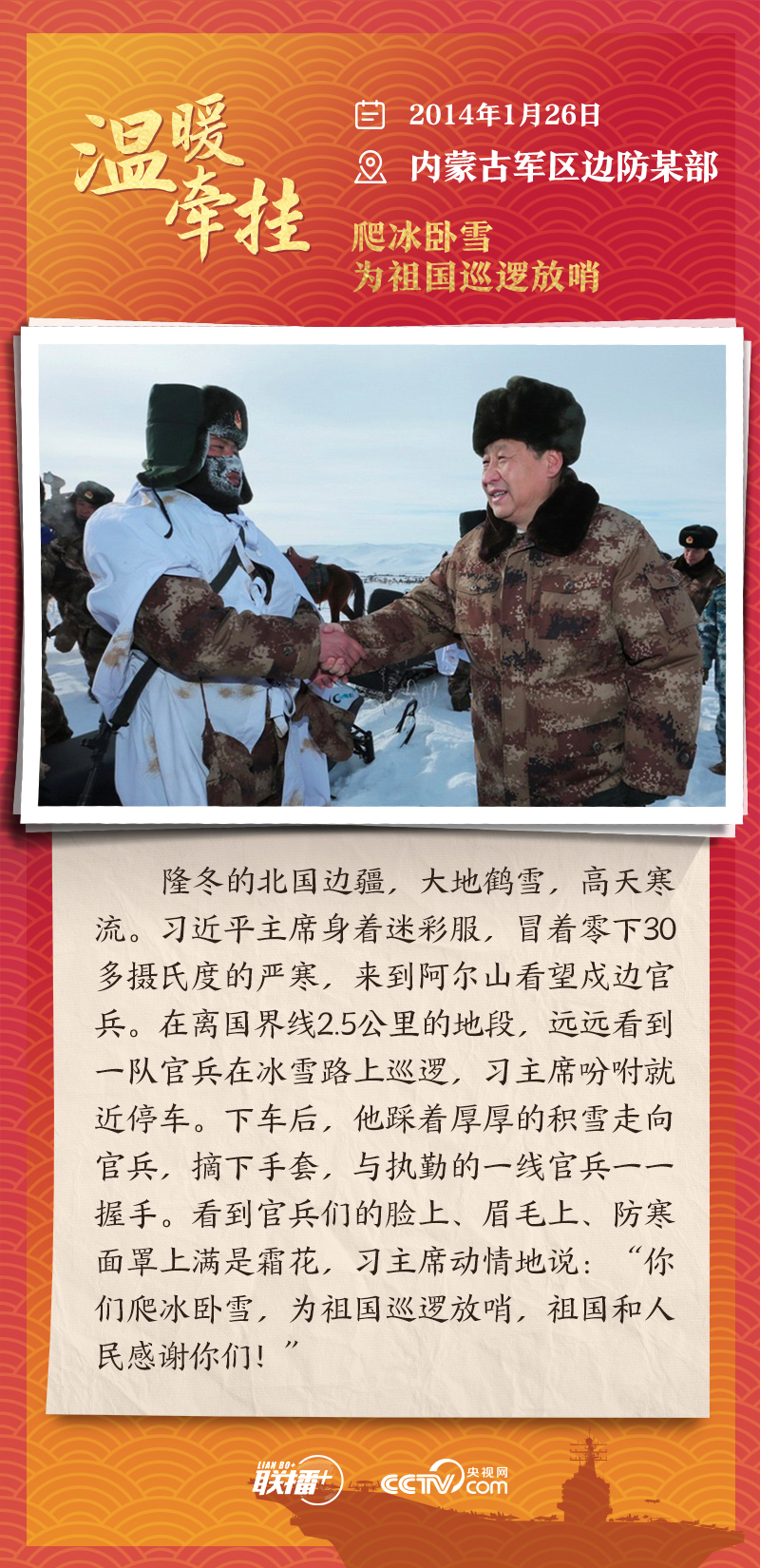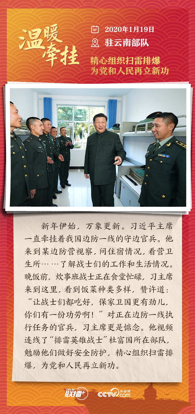 联播+踏边关、走戈壁、入班排、看哨所……党的十八大以来,每逢新春佳节到来之际,即使行程再满,习近平主席也会留出时间来到军营、训练场或边防线,看望或亲切接见驻地部队官兵,代表党中央和中央军委,向全体人民解放军指战员、武警部队官兵、民兵预备役人员致以诚挚问候和新春祝福。