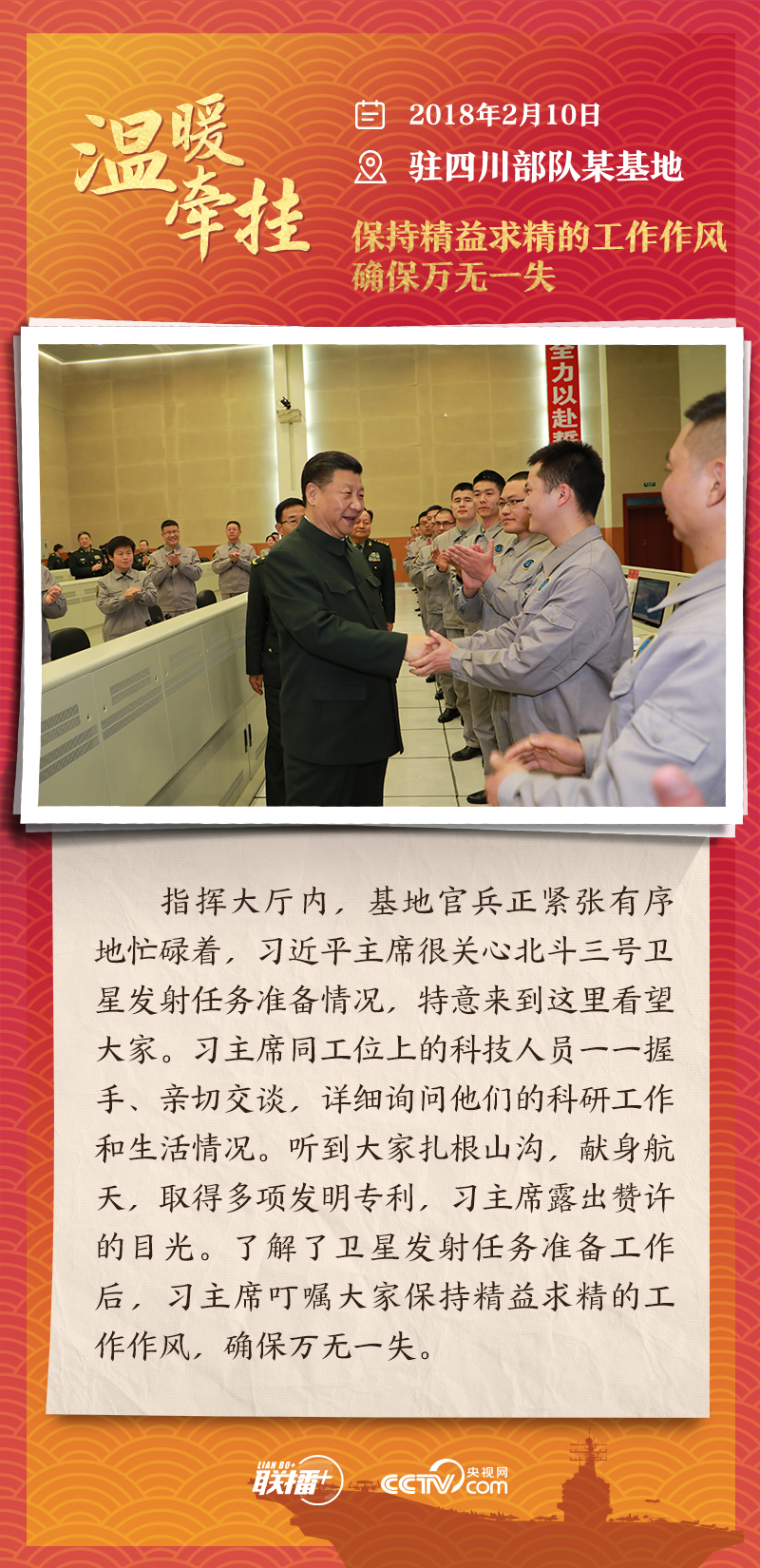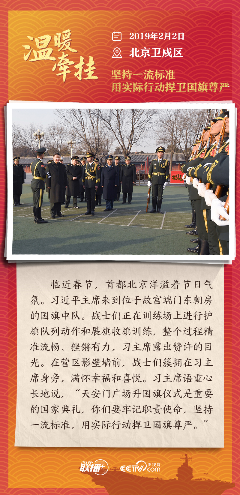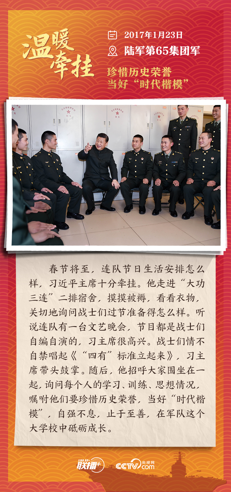 联播+踏边关、走戈壁、入班排、看哨所……党的十八大以来,每逢新春佳节到来之际,即使行程再满,习近平主席也会留出时间来到军营、训练场或边防线,看望或亲切接见驻地部队官兵,代表党中央和中央军委,向全体人民解放军指战员、武警部队官兵、民兵预备役人员致以诚挚问候和新春祝福。