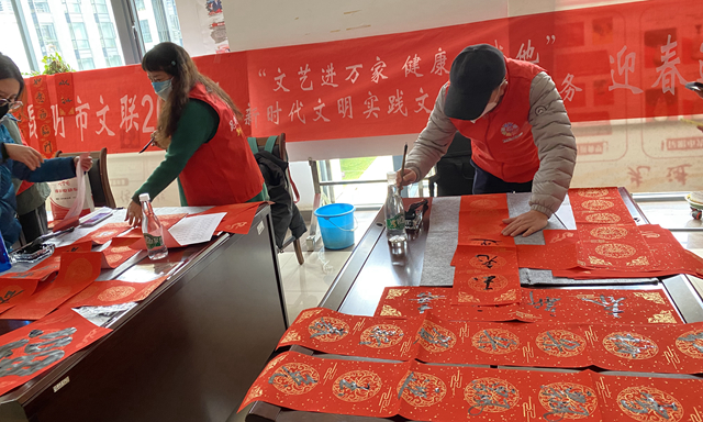 昆明信息港讯 记者甘凌菲 新春佳节将至,为营造欢乐祥和的节日氛围,增强干部职工的文化自信,1月18日上午,昆明市文联2023年迎春送福文艺志愿服务活动在市级行政中心举行。4名昆明书法家协会成员现场写春联、写“福”字,为干部职工送上了美好的新春祝福。