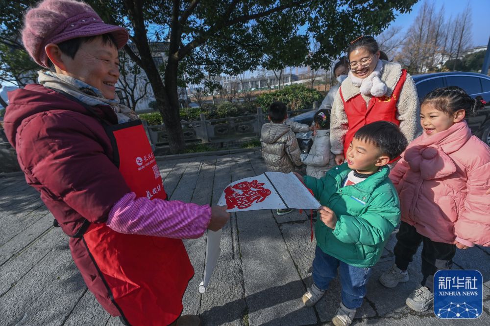临近春节,浙江省湖州市长兴县李家巷镇中心幼儿园的教师志愿者带领孩子开展以“巧手剪纸迎兔年”为主题的迎新年民俗活动。孩子们在老师的指导下剪出各种福兔剪纸,并将福兔剪纸作品送到周边村民手中,表达辞旧迎新的美好愿望。(新华社记者 徐昱 摄影报道)