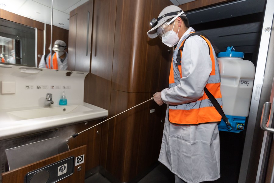 1月16日,工作人员在列车内进行消毒作业。(新华社记者王翔摄)