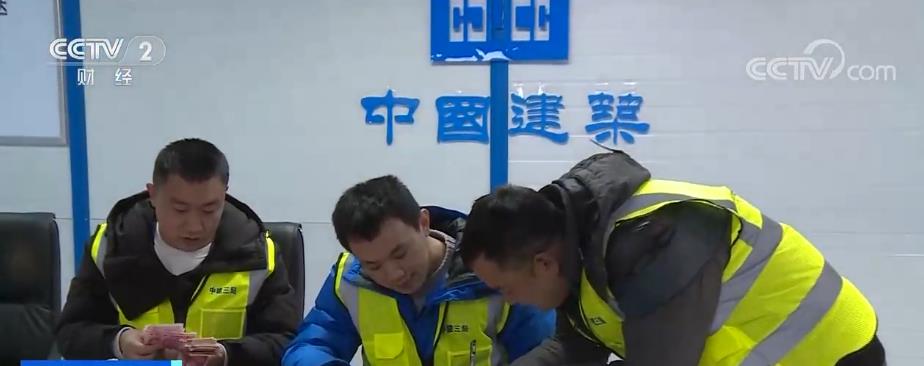 在成都科创新城科幻馆项目部会议室,部分工人正在现场排队领取他们本月度的现金工资。为了让大家踏踏实实过个年,项目部赶在春节之前将本月度的工资结算。