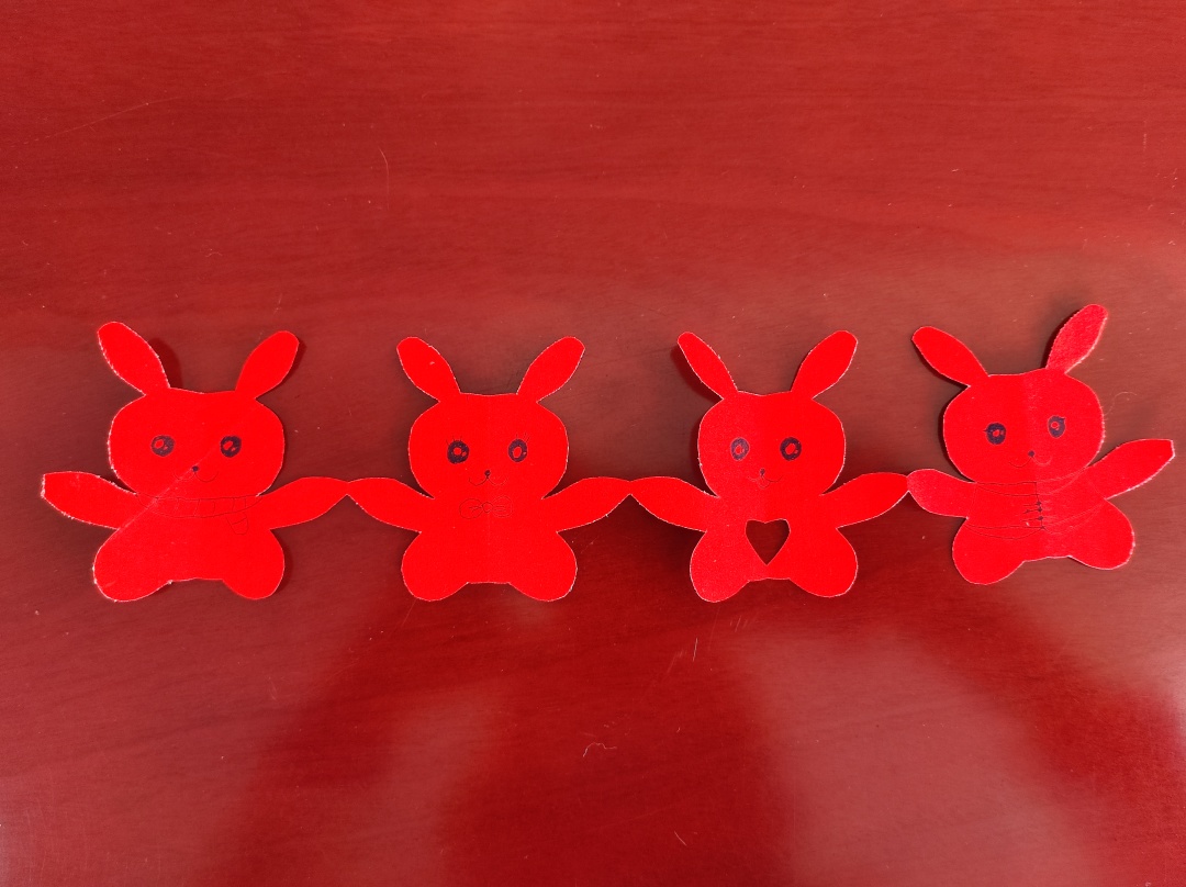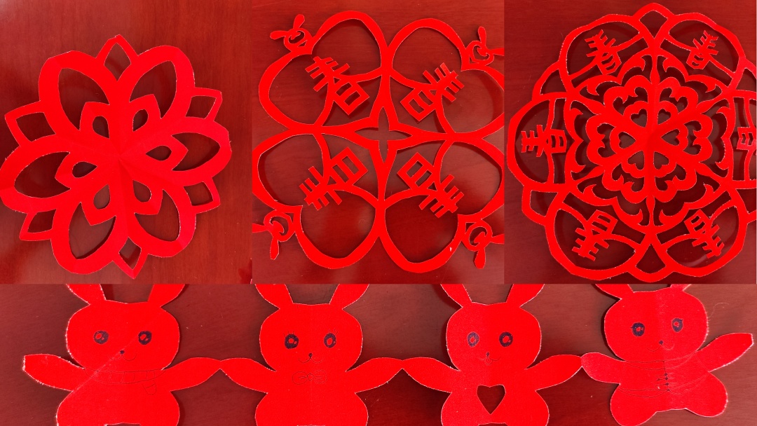 大家围坐在一起,有的裁剪纸张,有的负责画图案。小剪刀手中拿,大家一起来剪窗花,伴随着一声声轻轻的“咔嚓”“咔嚓”声,寓意美好、风格独特的窗花在剪刀的一起一落间,一张张轻灵的“春”、“小兔子”等造型图案跃然而出。