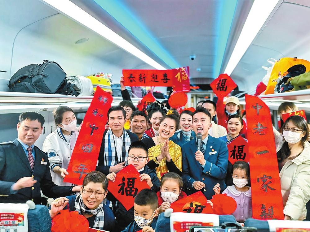 “长空雁,雁儿飞,哎呀雁儿呀……”1月19日,在昆明至西双版纳的C272次动车车厢内笑声欢快、掌声迭起,一场以“中老一家亲,祥和中国年”为主题的中老铁路“列车春晚”拉开帷幕。