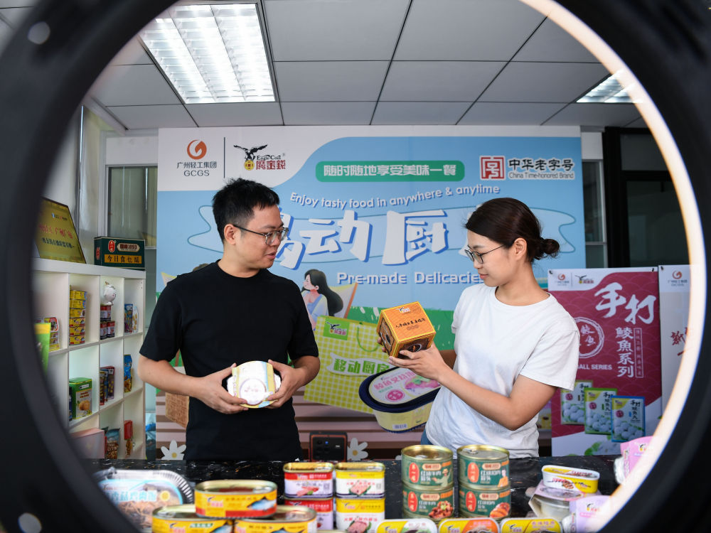2022年10月14日,广州鹰金钱食品集团有限公司工作人员在进行广交会线上直播的准备工作。新华社记者 邓华/摄