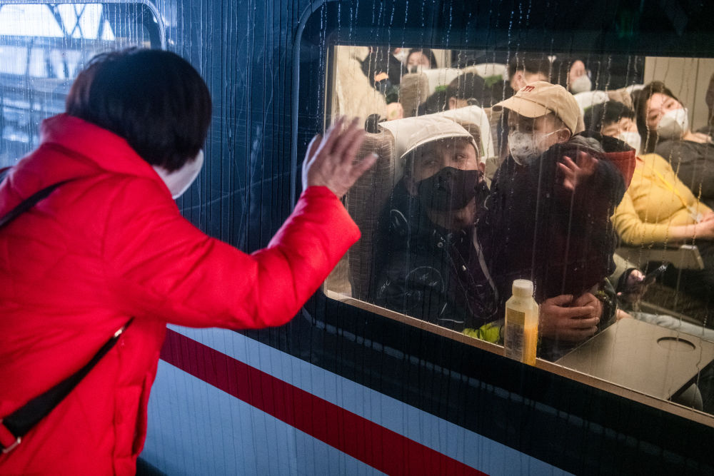2023年1月7日,在武汉站站台,旅客与亲人告别。当日,2023年春运启动。新华社记者 伍志尊/摄