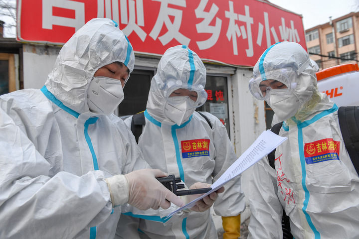 2022年3月18日,吉林省吉林市消防救援支队党员先锋突击队队员在进行社区消杀工作安排。新华社记者 张楠/摄