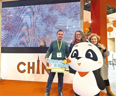 2023年马德里国际旅游展参展各方热切期待中国游客到来。图为在中国展台,观众与熊猫立牌合影留念。 本报记者 颜 欢摄