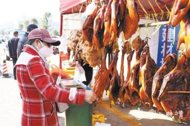 记者看到,滇东饮食文化城年货街人来人往,各种兔元素的福字、对联、灯笼、挂件等装饰品吸引人们的目光,肉类、糖果、干果、水果和小商品摆满街头。购买年货的人们驻足挑选,老板不停地向人们介绍商品款式、价格,现场气氛火热。