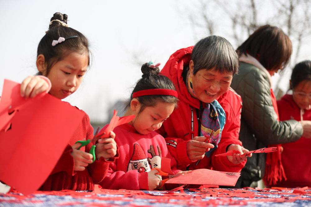 ↑1月19日,在浙江省湖州市德清县洛舍镇三家村,孩子们学习制作生肖兔剪纸。新华社发(王正 摄)
