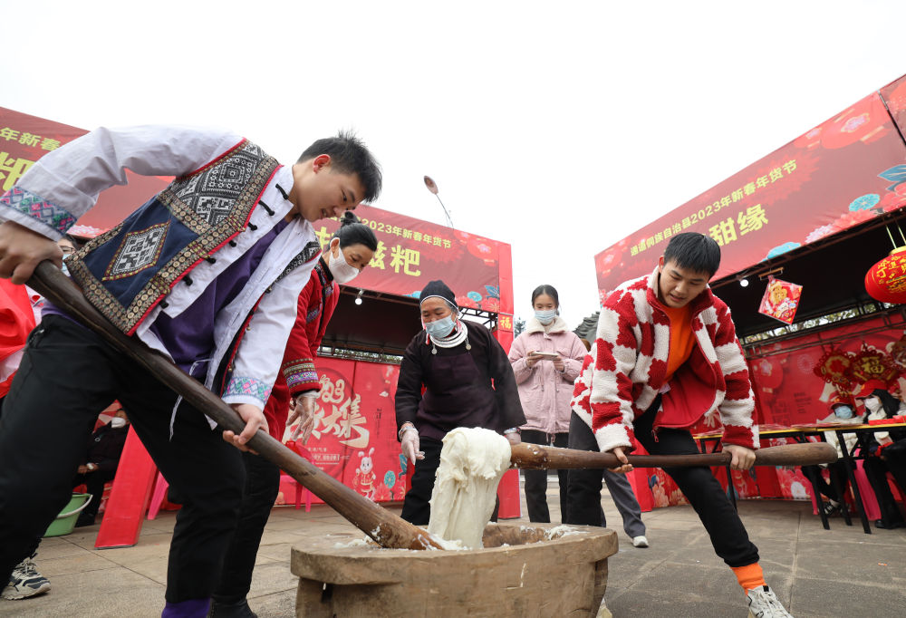 ↑1月18日,在湖南省通道侗族自治县新春年货节上,居民在体验打糍粑。新华社发(粟勇主 摄)