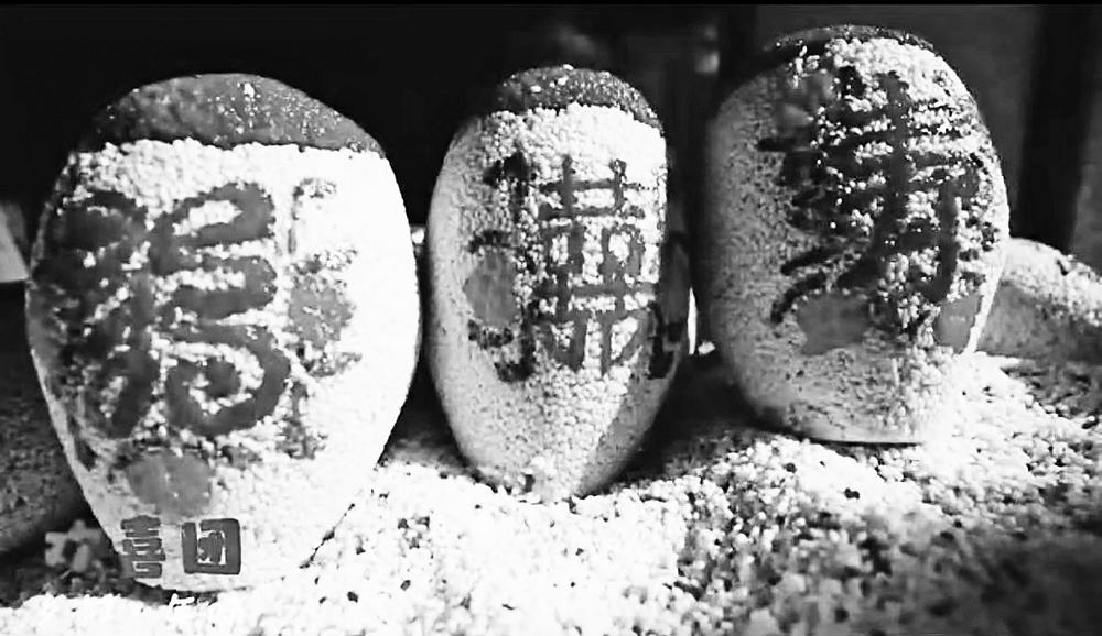 当地制作米花团的米花以糯米为原料,在柴火灶上炒至发泡成米花,再熬制麦芽糖浆。将米花和糖浆混合后,在微热的状态下,老匠人们娴熟地将米花揉滚成类似圆柱,盖上“红头”,最后在米花团上用植物染料绘制上“福”“招财进宝”“年年有余”等图案。