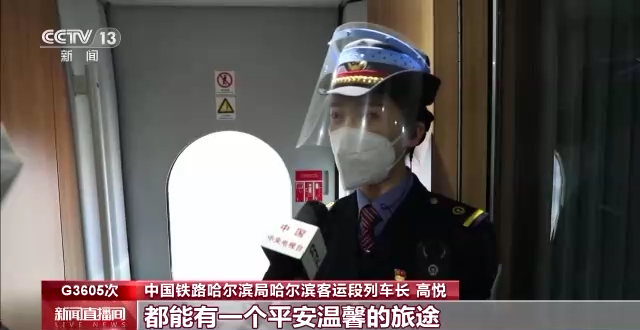 中国铁路哈尔滨局哈尔滨客运段列车长 高悦:希望每一位旅客都能够有一个平安温馨的旅途,也希望我们的家人都能够身体健康,万事如意,希望我们的祖国越来越好。