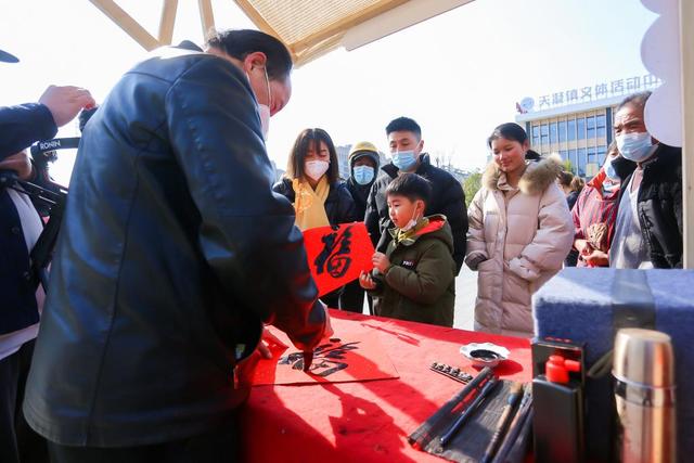 1月18日,嘉善县天凝镇首届农旅文化节“凝好”农创非遗年货市集现场,市民们排队免费领取乡贤文化能人张志良现场书写的“福”。(受访者供图)