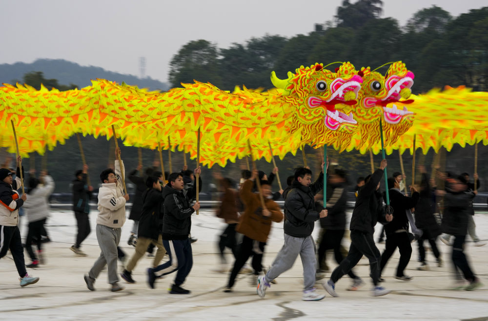 1月18日,在重庆市铜梁区巴岳山玄天湖景区的山水实景剧《追梦·铜梁龙》剧场内,铜梁龙舞的表演者们进行龙舞彩排。
