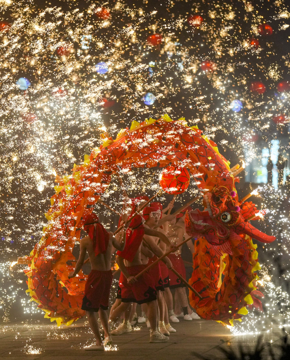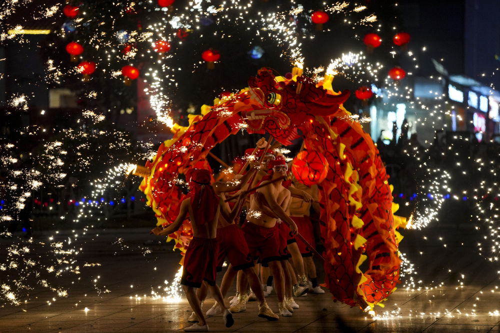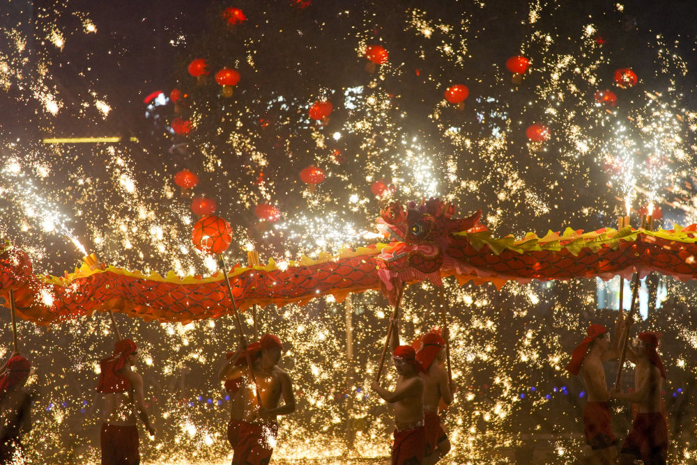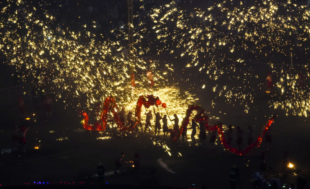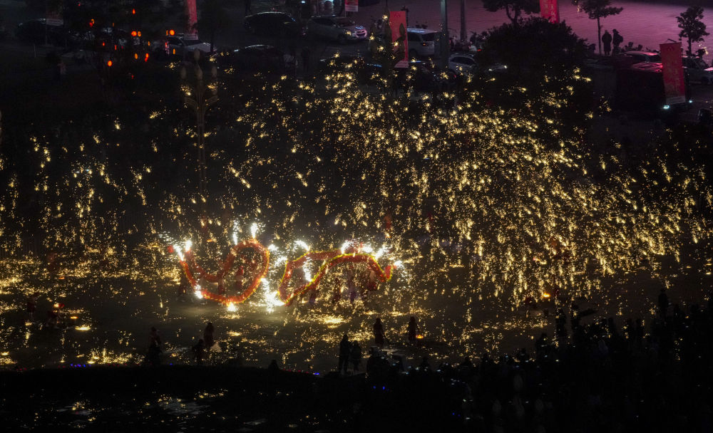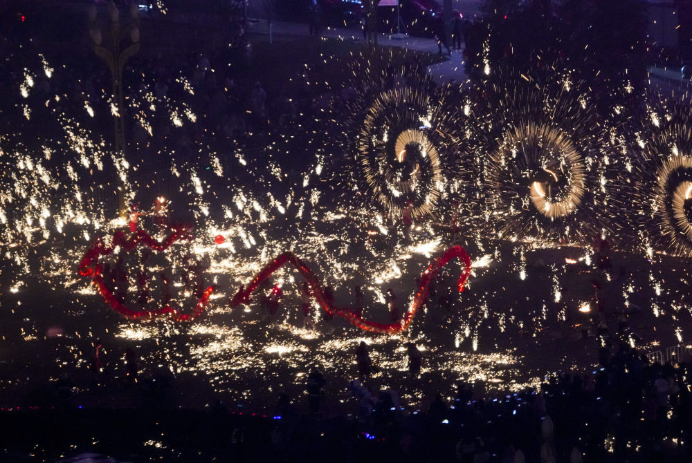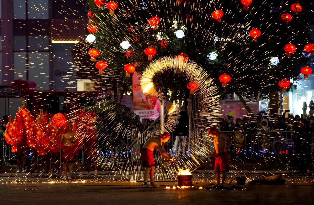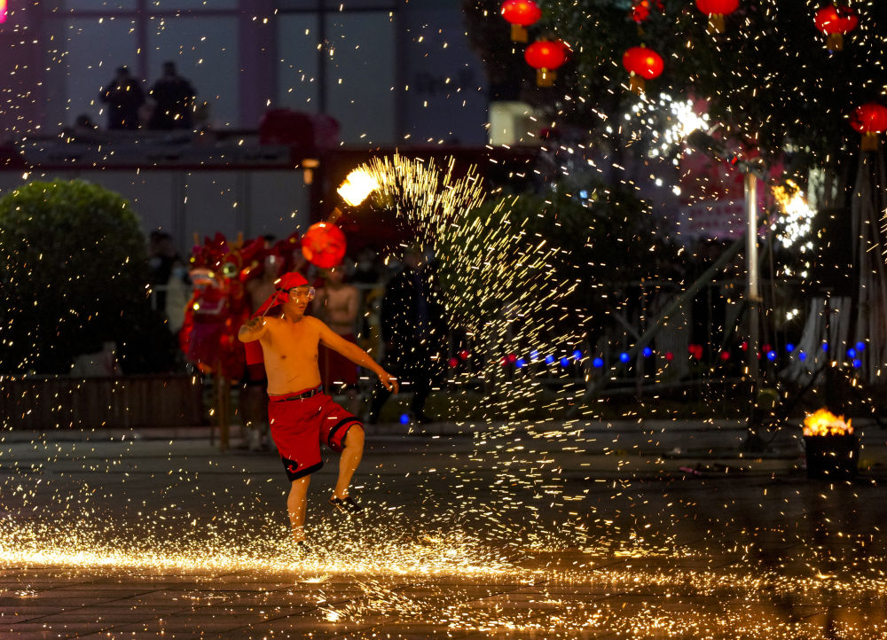 1月18日,重庆市铜梁区的龙城天街的广场上,铜梁火龙队的队员表演铜梁火龙的打铁水花。
