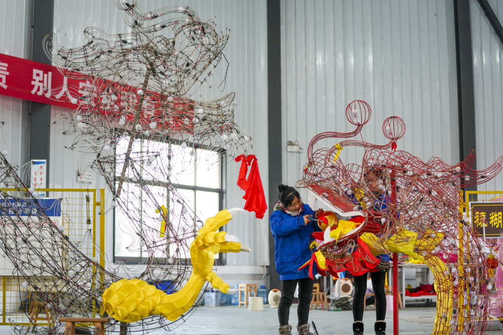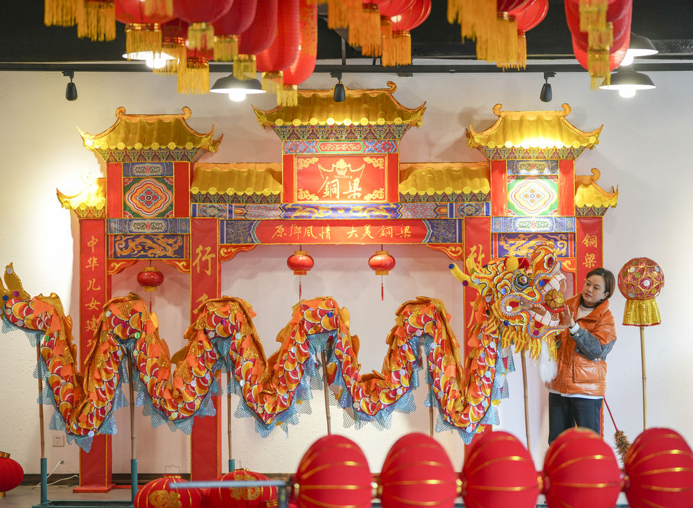 1月19日,在重庆市铜梁区巴川街道玉皇村龙灯彩扎基地内,一名工作人员整理基地展示的彩扎铜梁龙。