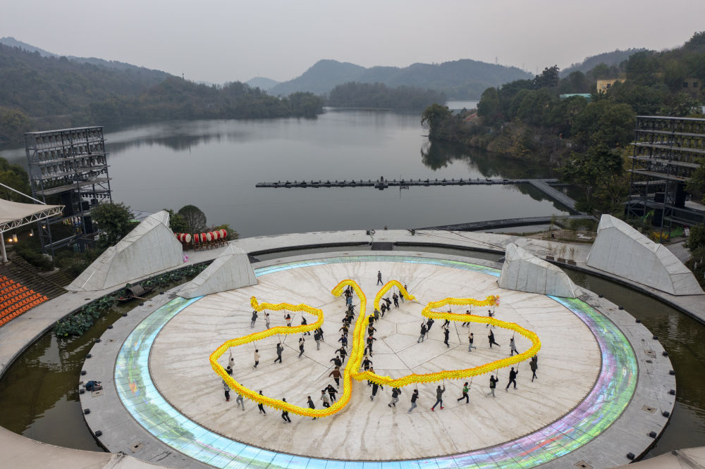 1月18日,在重庆市铜梁区巴岳山玄天湖景区的山水实景剧《追梦·铜梁龙》剧场内,铜梁龙舞的表演者进行龙舞彩排(无人机照片)。