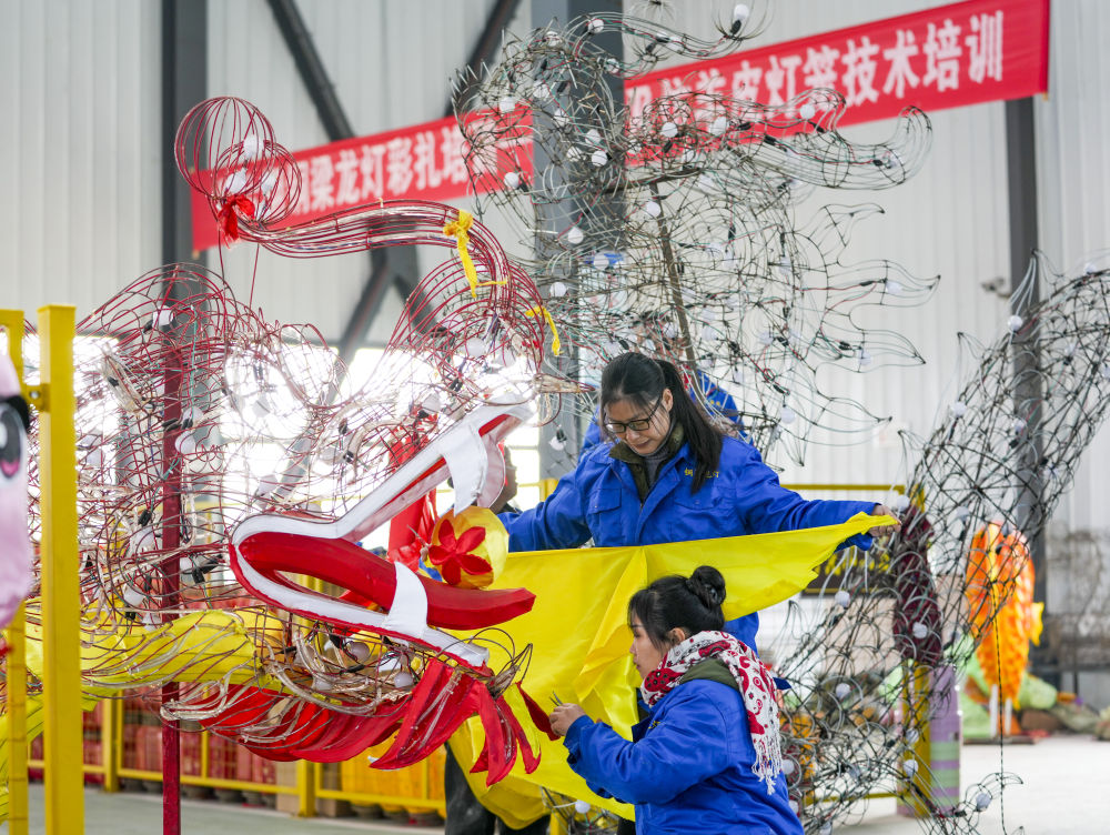 1月19日,在重庆市铜梁区太平镇坪漆村龙灯彩扎基地的乡村振兴车间内,两名村民制作铜梁龙灯。