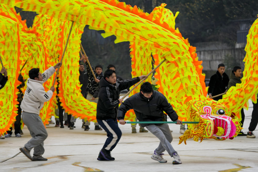 1月18日,在重庆市铜梁区巴岳山玄天湖景区的山水实景剧《追梦·铜梁龙》剧场内,铜梁龙舞的表演者进行龙舞彩排。
