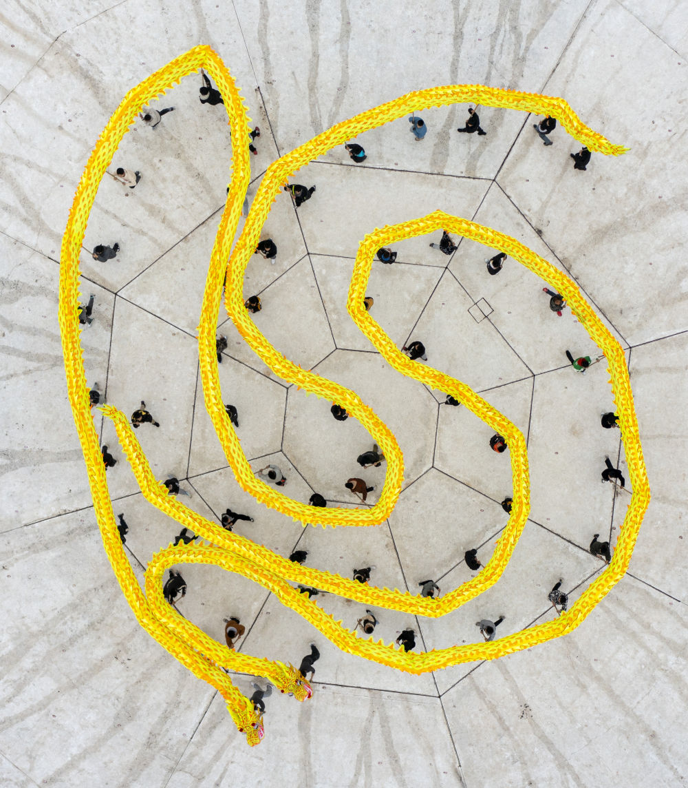 1月18日,在重庆市铜梁区巴岳山玄天湖景区的山水实景剧《追梦·铜梁龙》剧场内,铜梁龙舞的表演者们进行龙舞彩排(无人机照片)。
