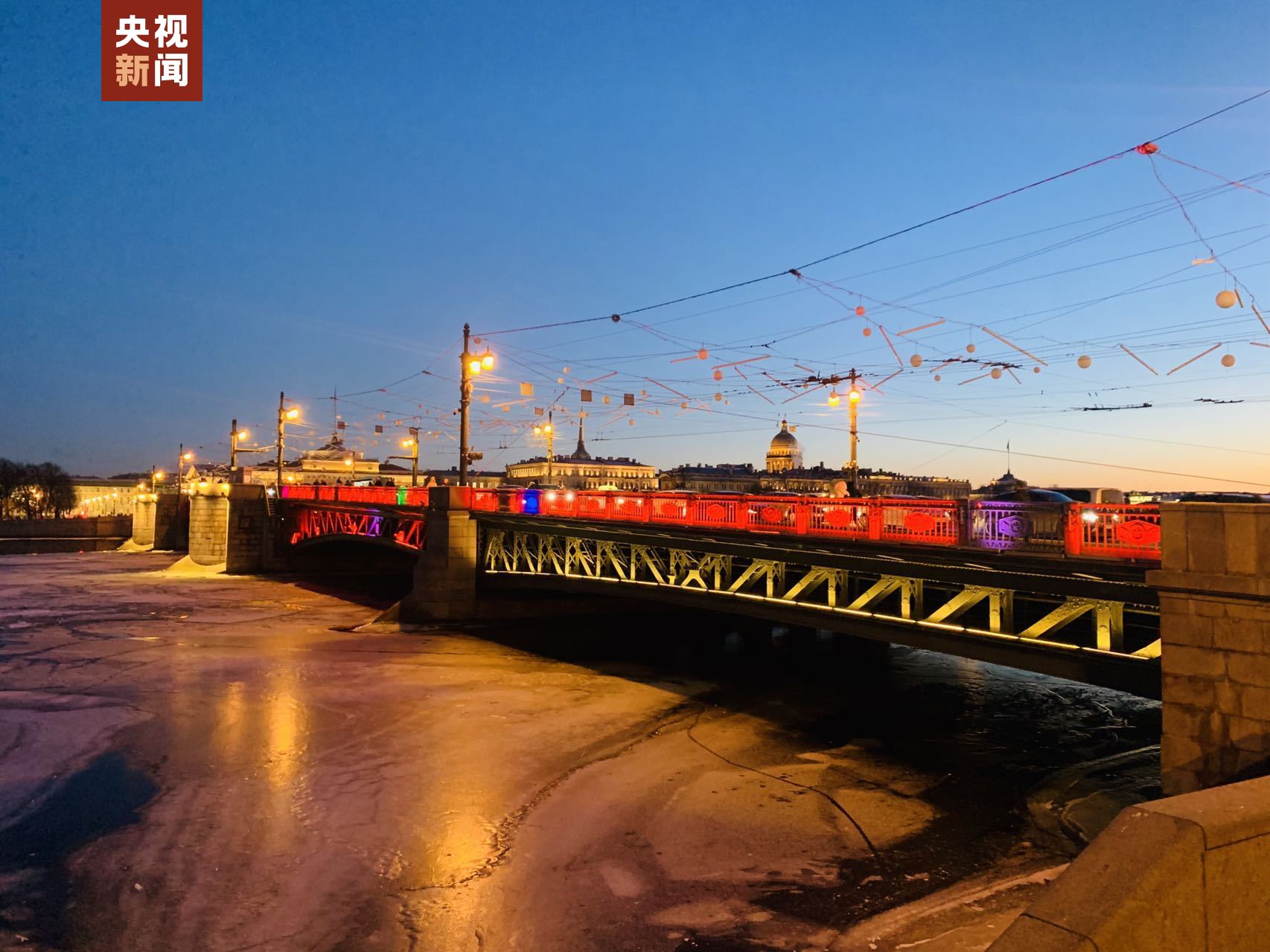 冬宫桥是圣彼得堡涅瓦河上的一座开启桥,北接瓦西里岛,南接冬宫与海军部大厦之间的宫廷路,是圣彼得堡交通最繁忙的一座桥,同时该桥也是著名的旅游景点。当晚冬宫桥上的彩灯瞬间被点亮,身披红妆的冬宫桥给俄罗斯北方之都的隆冬季节增添了欢乐的节日氛围,许多市民纷纷与亮着红灯的大桥合影。根据圣彼得堡市政府公布的消息,亮灯活动自中国农历新年起持续两周,至正月十五元宵节后结束。(总台记者 徐鸿波)