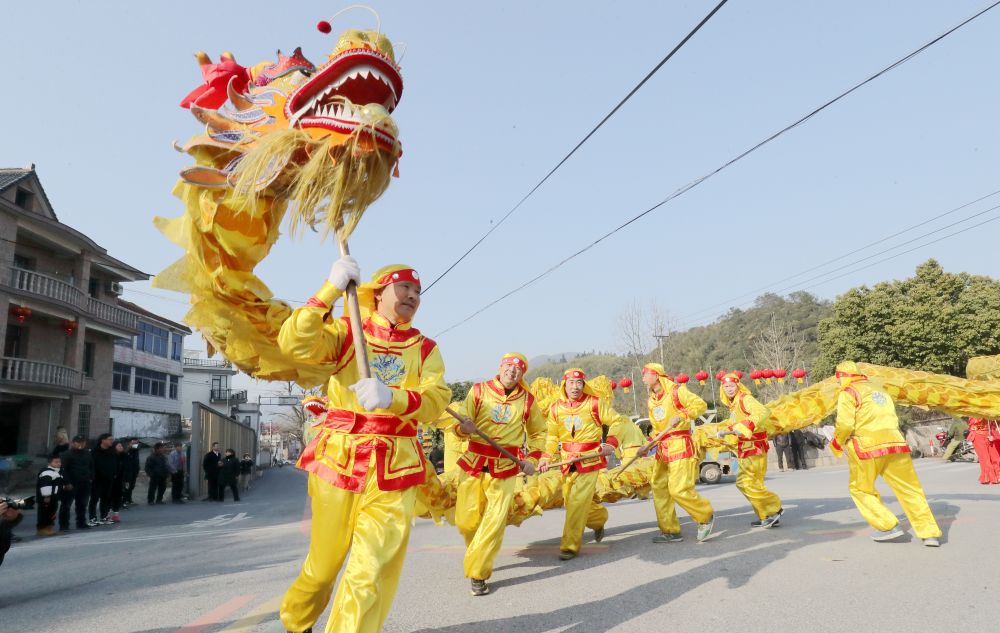 浙江湖州市德清县莫干山镇的村民在表演舞龙(1月19日摄)。新华社发(谢尚国 摄)