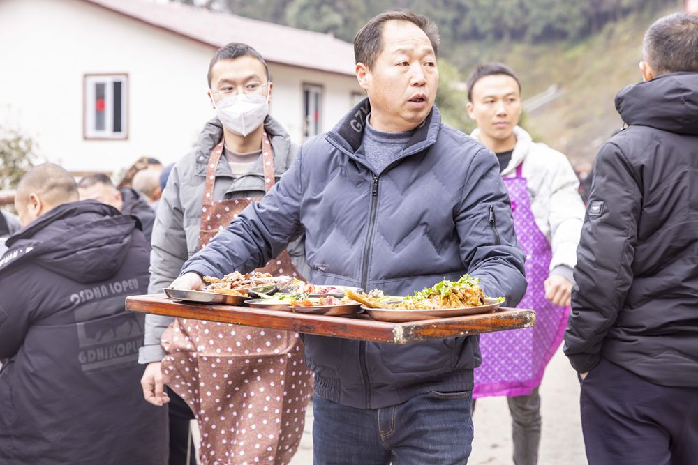 春节前夕,刚搬进新家的四川省雅安市芦山县太平镇大河村村民忙着将“九大碗”菜品端上桌。(芦山县委宣传部供图)