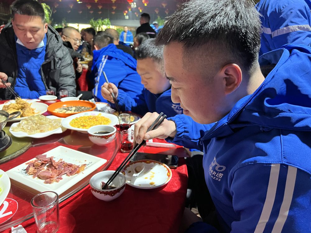 除夕夜,贾晨晨(右一)和同事们一起吃年夜饭。(受访者供图)