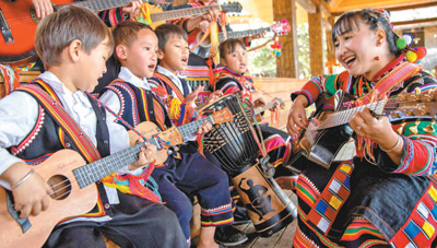 老达保村中的“百灵鸟”李娜倮与孩子们一同弹奏吉他,感受音乐带来的欢乐与幸福。虎遵会摄(人民视觉)
