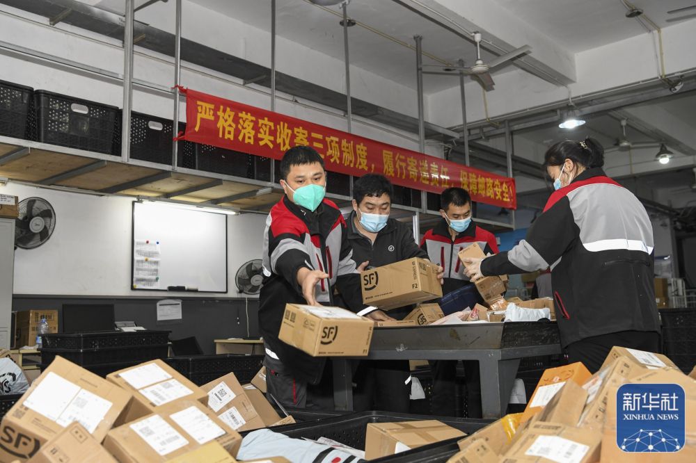 1月21日,顺丰深圳南山科技园站点快递小哥杨磊(左一)和同事们开始忙着分拣快递。新华社记者 梁旭 摄